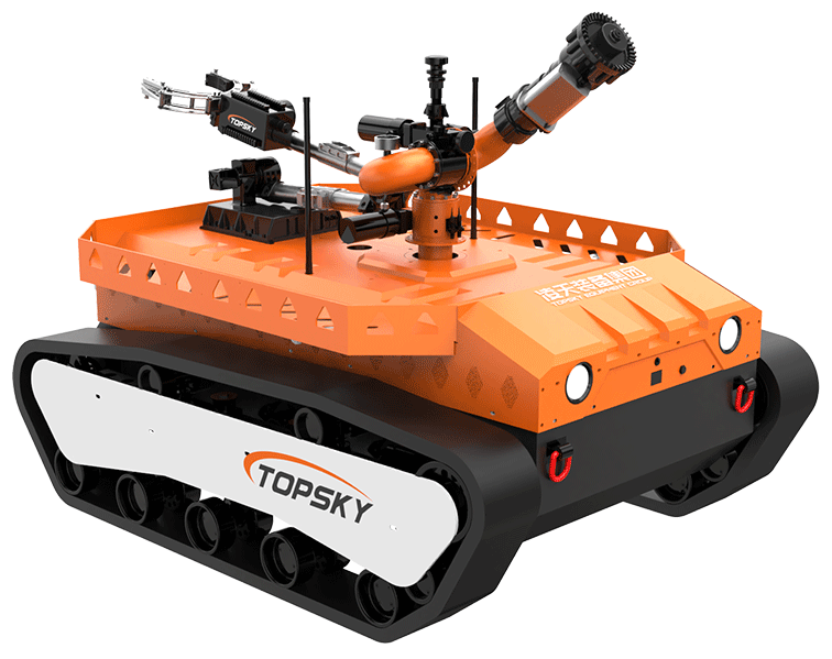 履帶式防爆機器人底盤采用鋰電池電源作為動力源,使用無線遙控的方式遠(yuǎn)距離操控,裝載7自由度排爆機械手能實現(xiàn)不同角度旋轉(zhuǎn),機械臂可裝載爆炸物銷毀器,可現(xiàn)場摧毀爆炸物,采用履帶+單擺臂結(jié)構(gòu),能適應(yīng)各種地形快速作戰(zhàn)部署。