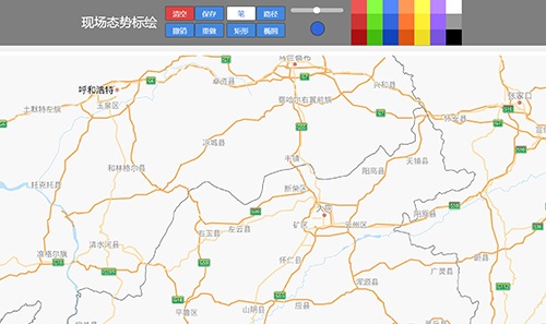 現(xiàn)場(chǎng)態(tài)勢(shì)標(biāo)繪,可進(jìn)入到地圖中,進(jìn)行線路的制作、路徑、矩形、圓形等操作選擇,及可對(duì)操作步驟進(jìn)行撤銷及畫筆的顏色選擇