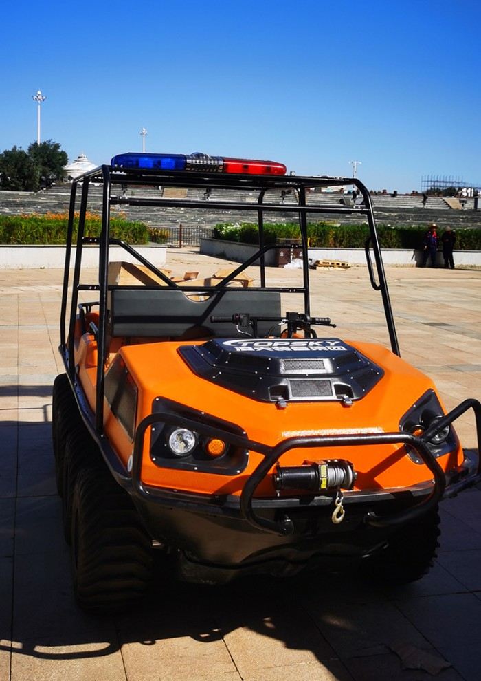 在復(fù)雜惡劣的地形條件和自然環(huán)境下,水陸兩棲全地形車可以讓搜救隊員和攜帶的救援裝備快速到達救援現(xiàn)場,減少徒步帶來提供消耗,完成最后一公里最好五分鐘緊急救援任務(wù)。水陸兩棲全地形車可配備點到絞盤、救援擔(dān)架組件、探照燈、警示燈、警報器、脫鉤、破拆工具等裝備, 給救援團隊提供救援保障,更安全的解救傷員和疏散群眾。