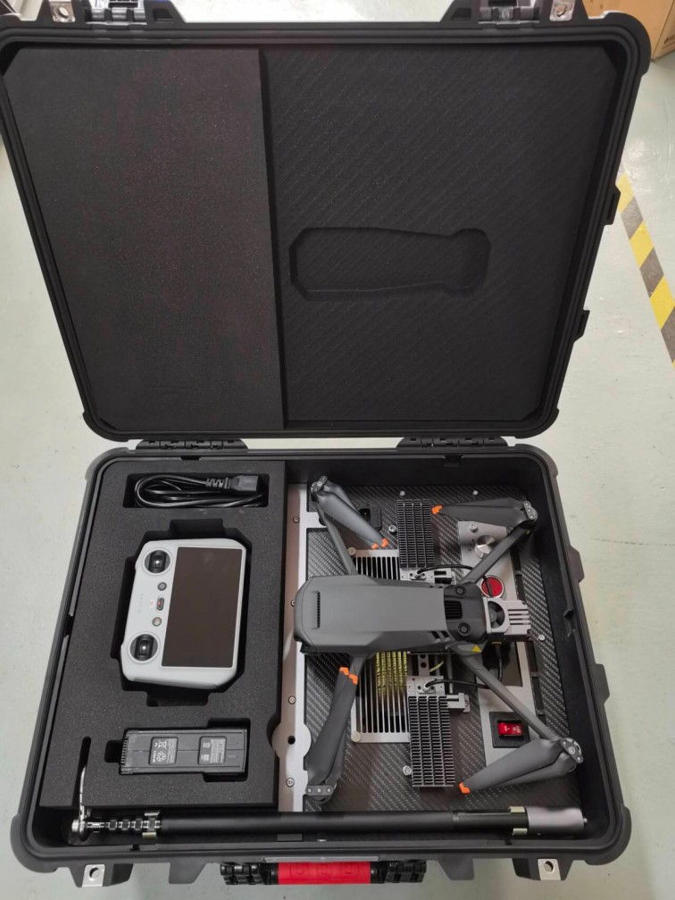 本無人機為北京凌天智能裝備集團研發的陸空兩棲三維偵測建模無人機,采用四旋翼機身設計,載重大,續航長,并且機體折疊標準化負載接口。同時,該無人機具備陸空兩棲功能,可以在地面行駛。